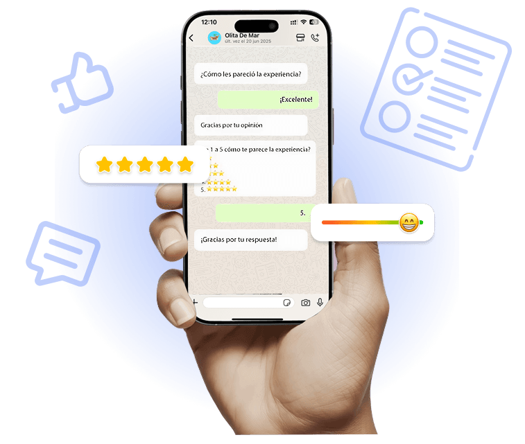 Capta reseñas por WhatsApp en menos de 30 segundos. La plataforma las filtra, se responden y tú ganas posicionamiento en Google y fidelizas clientes.